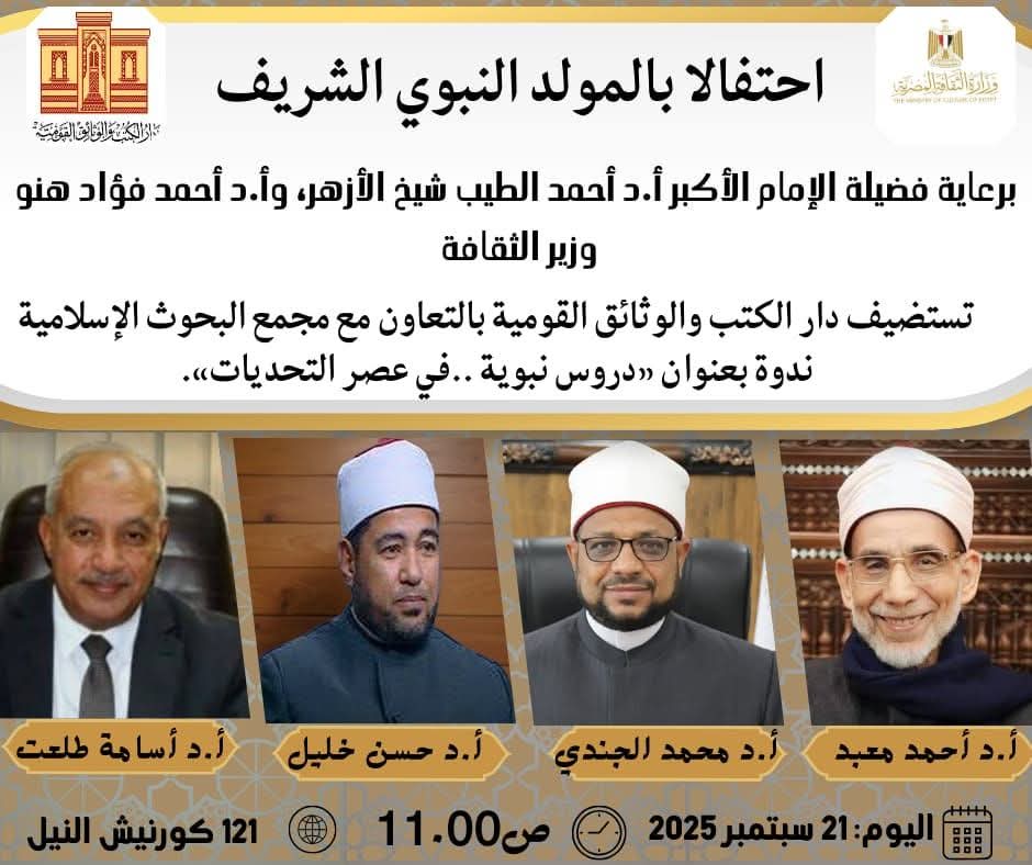 تحت رعاية فضيلة الإمام الأكبر د. أحمد الطيب، شيخ الأزهر، و د. أحمد فؤاد هنو وزير الثقافة، تستضيف الهيئة العامة لدار الكتب والوثائق القومية، بالتعاون مع مجمع البحوث الإسلامية ندوة لمجلة الأزهر الشريف، بعنوان «في ذكرى المولد الشريف.. دروس نبوية في عصر التحديات»، وذلك بمقر دار الكتب والوثائق القومية في الحادية عشرة صباح الأحد 21 سبتمبر، احتفاءً بذكرى سيد الخلق صلى الله عليه وسلم.