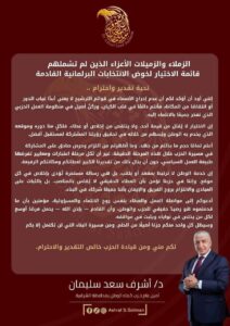 – وأضاف الدكتور أشرف سعد سليمان أنه لمن دواعي سرور الحزب أن يكون حماة الوطن بالشرقية.. في طليعة الصفوف لقيادة القائمة الوطنية بثقة وإرادة وطنية